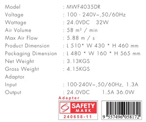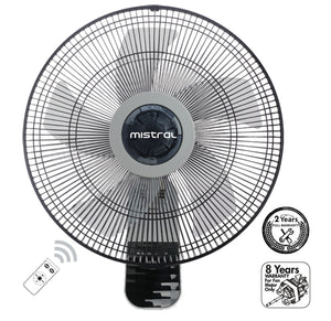 Mistral – MWF4035DR wall mount DC fan, 16inch blade, 5-blades ABS, air volume 58m³/min, air velocity 5.88m/s, 24VDC-32W, 10 speed selection, auto oscillation with remote control.
